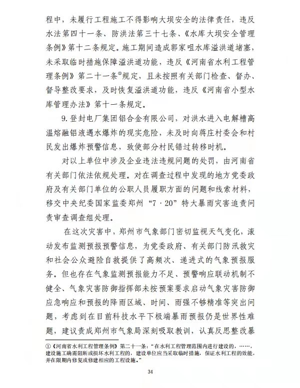 调查认定:这是一起由极端暴雨引发严重城市内涝,涝水冲毁停车场挡水围墙、灌入地铁隧道,造成14人死亡。郑州地铁集团有限公司擅自变更设计,未上报发改委审核,设计单位违规向施工单位提供白图,郑州地铁集团有限公司违规同意采用白图施工,施工单位违规采用白图施工,质监站未发现问题和缺陷,并出具了工程质量验收合格的监督意见。郑州市雨水管道仅2400余公里,196.3亿海绵投资,实际与海绵城市相关的仅占32%,用于景观、绿化等占近56%。
