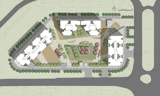 在此项目中,设计团队希望可以追求更多绿色、亲近自然的空间。整个场地沿道路形成大大小小不同的口袋公园,提升场地活力与城市友好性。项目打造 8000 ㎡的园林景观,包含山花园、海花园、村花园及绿地广场,还融入“风、花、雪、月”四大元素,打造特色化景观花园。围绕 3 栋塔楼外围形成外环消防车道,通过立体化的消防“绿环”将社区串联,整体打造成漫步观景平台,为社区居民营造舒适的生活氛围。