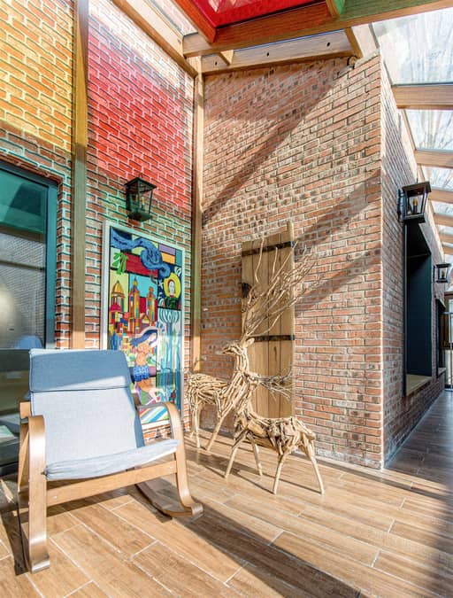 天友·零舍采用了可再生能源补给,屋面采用了传统民居双坡形式选择的非晶硅太阳能光伏瓦,不仅能为建筑提供自然转换的电能和热能,减少后期居住使用能耗,同时在太阳的照射下,形成波光粼粼的动态景象。阳光透过彩色薄膜光伏顶落在阳光房的墙面上,彩色的光晕将艺术氛围融入室内空间。